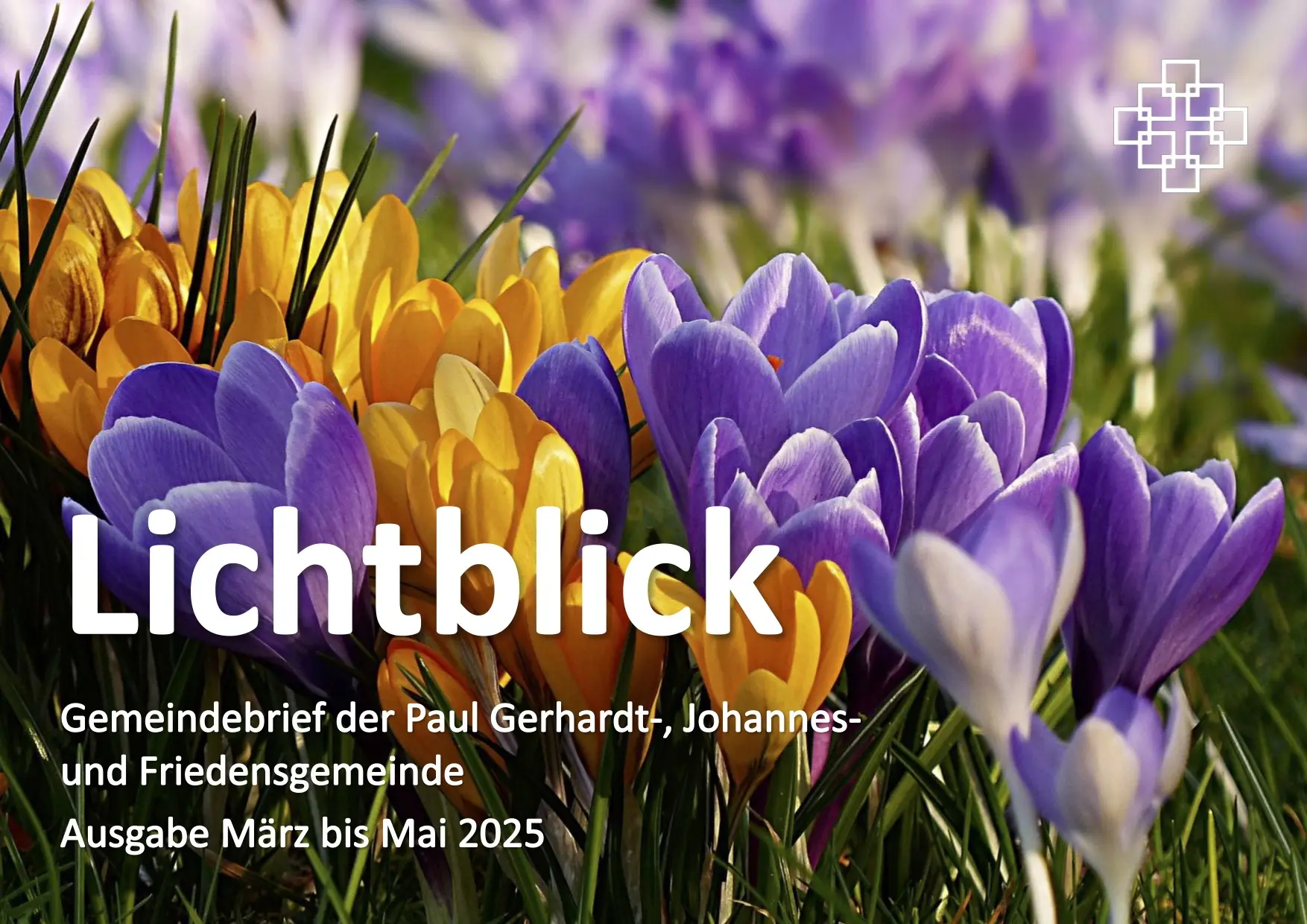 Der Gemeindebrief Lichtblick ist der Nachfolger von Unsere Seiten. Die Gemeindebriefe der Johannesgemeinde, der Paul-Gerhardt-Gemeinde und der Friedensgemeinde sind nun eins. Drei Redaktionen haben sich zusammengefunden und präsentieren Ihnen nun den „Lichtblick“, der Ihnen viel Erhellendes aus den Nachbargemeinden und dem Nachbarschaftsraum zeigen will und gleichzeitig den Blick auf den lenken will, der das Licht der Welt ist, Jesus Christus.