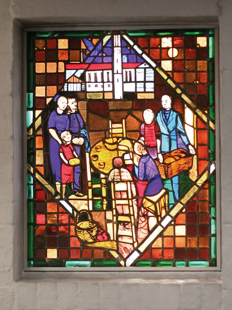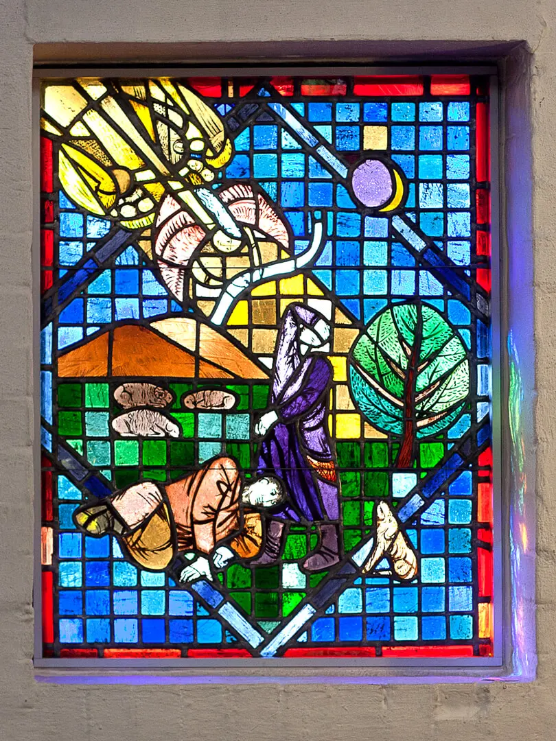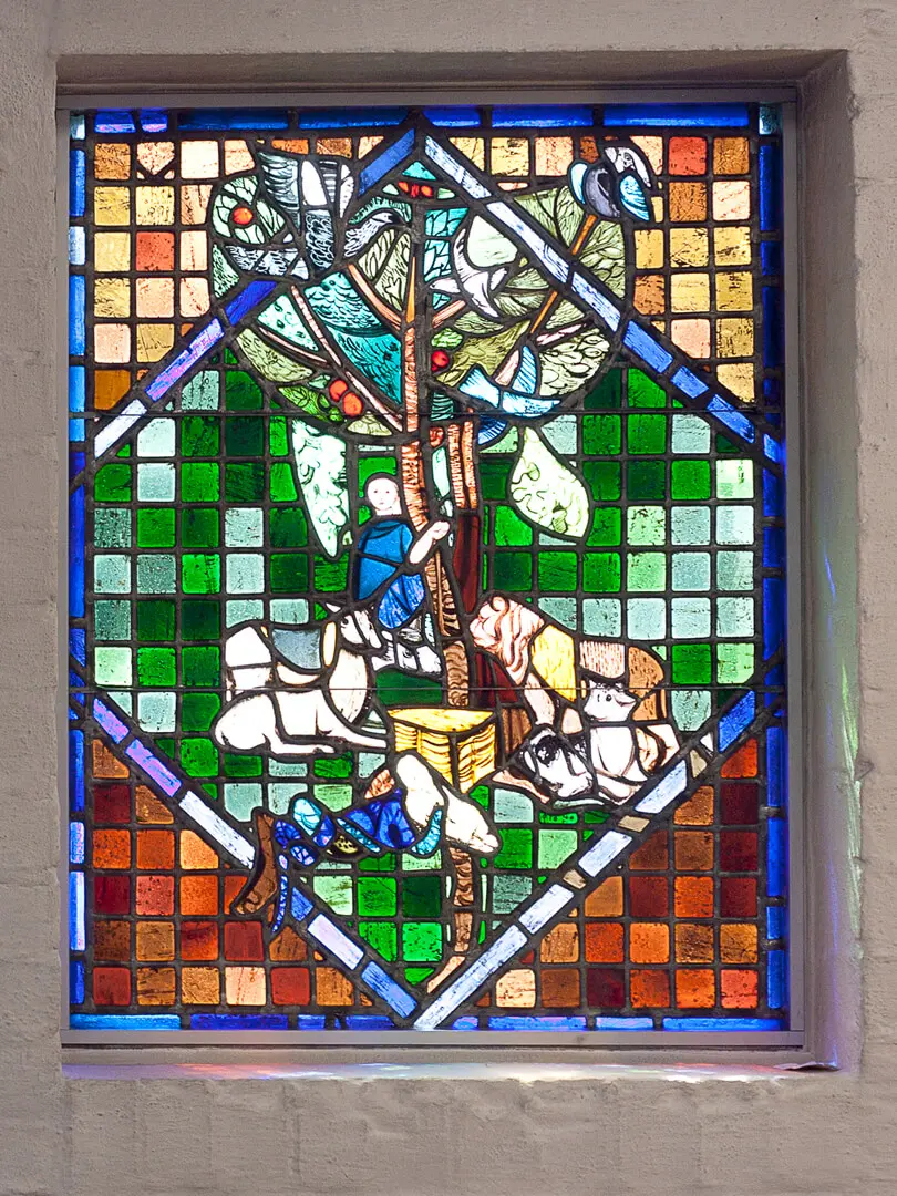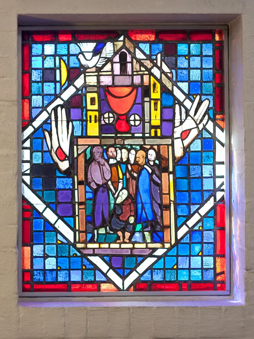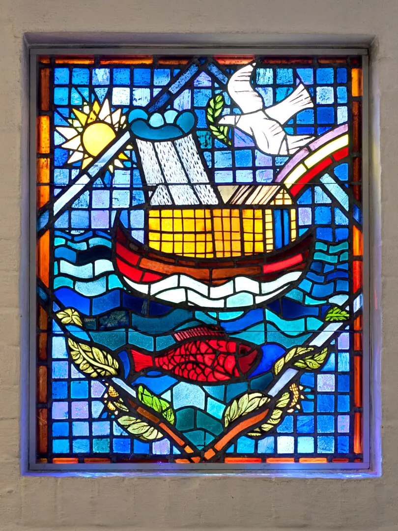 Das erste Fenster rechts vom Eingang zeigt den Friedensbund mit Noah nach der Sintflut, den Friedensbogen in den Wolken (rechts), die Arche, den Fisch im Wasser und die Taube mit dem Ölzweig.