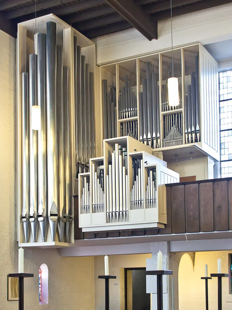 Das Hauptwerk der Orgel steht hoch über der Empore. Im Prospekt zu sehen sind die großen Pfeifen des Principal 8' und in den kleinen unteren Feldern die Pfeifen des Kornett 5fach. In die Brüstung eingelassen ist das Rückpositiv mit dem Principal 4' im Prospekt. An der Stirnwand der Kirche ist das Pedalwerk aufgestellt. Seine Prospektpfeifen sind die großen Pfeifen des Principal 16'. Das Pedalwerk steht auf zwei Windladen. Die untere Windlade liegt unmittelbar hinter den großen Prospektpfeifen, die obere Windlade liegt hinten an der Turmwand auf der gleichen Höhe wie die Windlade des Hauptwerks. Unter der oberen Pedalwindlade wurde das Gebläse eingebaut. Der Spieltisch mit der schwenkbaren Registrieranlage befindet sich am Unterbau des Hauptwerks.